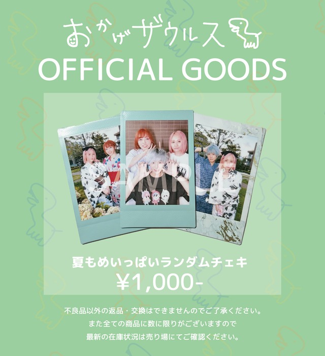 ※2025年10月4日の配信中のみ有効 ※送料無料です。複数枚注文時はまとめて発送致します。 おかげザウルスの配信中、その場でチェキを撮影し後日郵送させていただきます! 3周年の思い出にぜひどうぞ! 他のメンバーを同じ1枚のチェキに写したい場合は、それぞれのリアルタイムチェキをカートに入れて、一緒に注文してください!